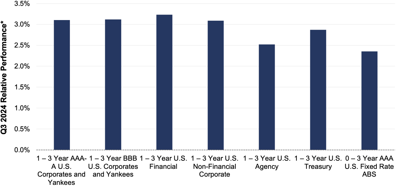 U.S. financials outperformed non-financial corporate debt due to a higher coupon advantage and greater spread tightening for financials versus industrials. BBB credit performance was essentially in line with AAA-A, suggesting better spread compression for higher-quality debt in the quarter.