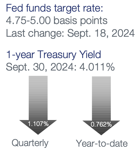 Monetary Policy – The Fed cut its federal funds target range by 50 basis points (bps) to 4.75% to 5.0% at the September 18 meeting. While a rate cut in September was fully expected by the market, expectations were split between 25 and 50 bps. The Fed’s post-meeting statement was updated to say the Committee has “gained greater confidence” inflation is moving toward its 2% target and risks to inflation and employment are judged as “roughly in balance.” The Fed continues to implement its balance sheet reduction program (quantitative tightening), with a monthly cap of $25 billion in Treasury securities and $35 billion of agency mortgage-backed securities. During the press conference Chair Powell stated at this point they are not thinking about stopping quantitative tightening as they cut rates, noting the two can happen in tandem and are both forms of normalization.