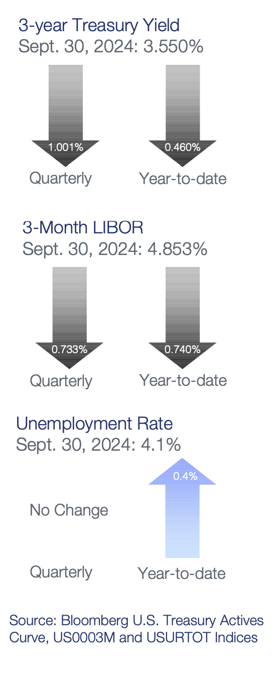 Economic Activity – The U.S. economy continues to perform well this year, exceeding expectations and defying traditional signals of recession. Following above-trend growth of 3.0% in the second quarter, U.S. Gross Domestic Product (GDP) is projected to grow near 2.0% for the third quarter (Q3) amid still-firm domestic demand and business investment. Personal consumption was steady throughout Q3 as income growth helped offset persistent headwinds from elevated prices and high interest rates. Labor market conditions cooled early in the quarter but rebounded in September, ending Q3 largely where it began, with August U.S. job openings stable at 8.0 million open positions while total unemployed workers in the labor force as of September were unchanged at 6.8 million. Monthly Non-farm Payrolls growth accelerated, averaging 186,000 during Q3 and the U3 Unemployment Rate was 4.1% in September, matching the level from June. Average Hourly Earnings growth is off its highs but remains elevated at 4.0% year-over-year (YoY), emphasizing still-solid labor demand. The Consumer Price Index (CPI) declined to 2.5% in August versus 3.0% in June as energy prices fell throughout the quarter. Core inflation continued its gradual downward trend with CPI ex. food and energy rising 3.2% YoY for August compared to 3.3% YoY in June. The Federal Reserve’s (Fed) preferred inflation index – the PCE Core Deflator Index – increased 2.7% YoY for August. While recent data has been encouraging, the inflation fight is not over as progress remains mixed, driven by core goods deflation. Further disinflation in core services and housing will be necessary to ultimately achieve the Fed’s 2% target and desired soft landing.