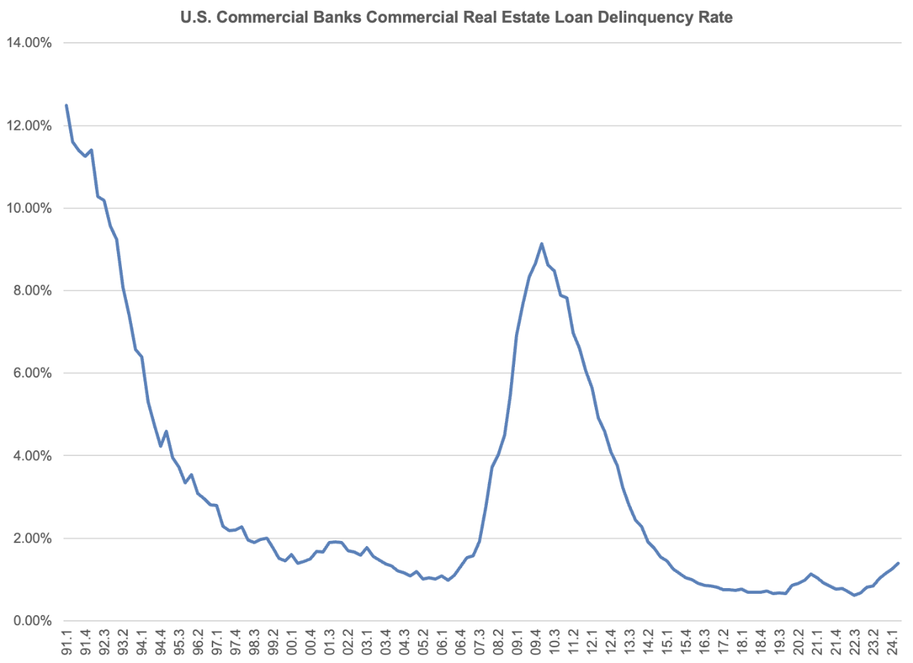 The following chart illustrates the delinquency rate across all CRE loans for all U.S. commercial banks from the end of the first quarter of 1991 (the first available data point) through the end of the second quarter of 2024.