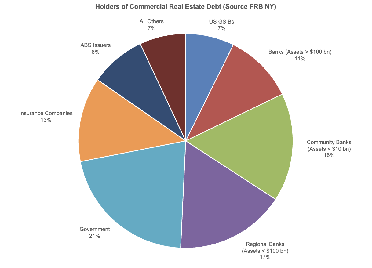 - Domestic banks have substantial financial exposure to commercial real estate and there are concerns for the banking sector, and by extension the broader economy, should default rates become unmanageable.
