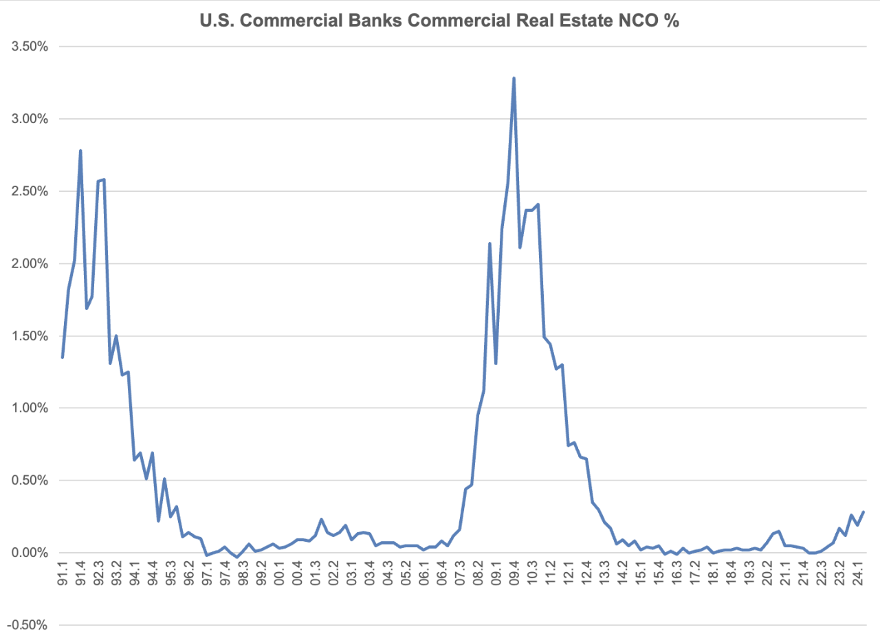 Relative to the Savings & Loan Crisis in the 1990’s and the Global Financial Crisis period, delinquencies remain low despite a national office vacancy rate approaching 20%. Net CRE charge-offs are similarly contained, although the following chart graphically highlights that losses in CRE can materialize suddenly and violently after extended periods of stability.