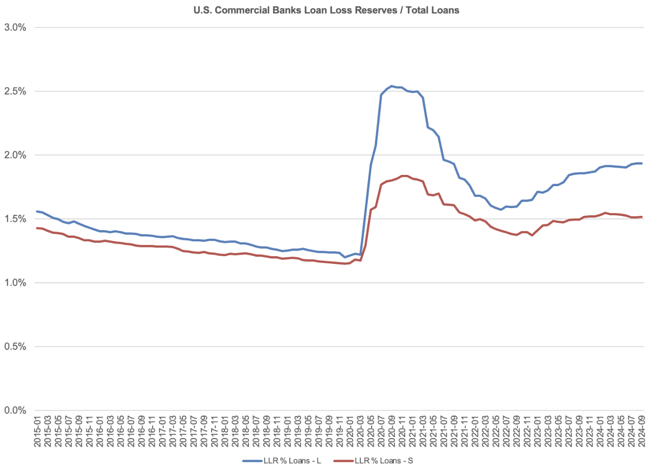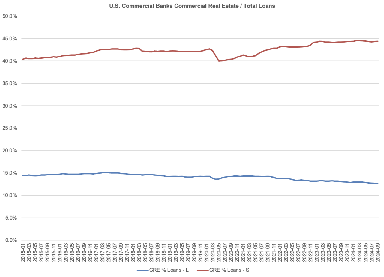 The absolute size of small bank (assets < $100 billion) exposure versus large banks is depicted in the following chart. Large bank exposure to CRE has been optically flat since pre-COVID, while small bank exposure continued to increase through the end of September 2024, albeit at a slower pace.