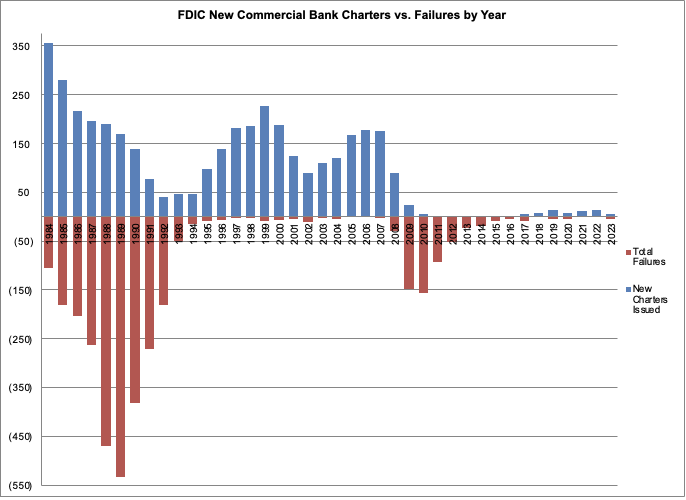 Incidentally, the number of banks supervised by the FDIC peaked in 1984 at 14,507, and the number of institutions has declined steadily over the following four decades to 4,036 at the end of 2023. As net new chartered banks exceeded failures over that period, the implication is that the shrinkage was driven by voluntary mergers or business cessations.