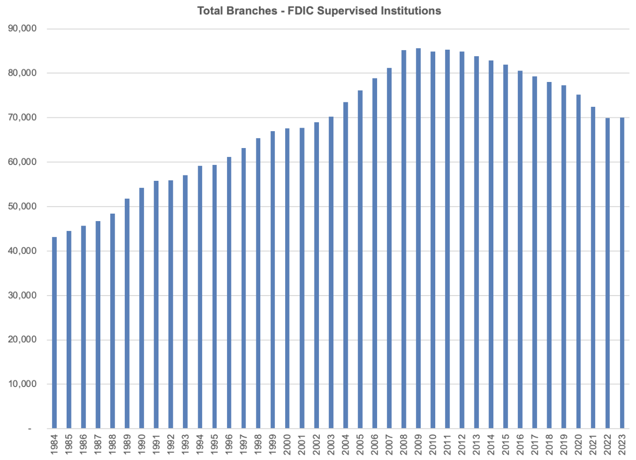 Motivations for merging vary, although technological innovation certainly ranks high among them. The spread of the internet in the 1980’s foreshadowed an increased volume of banking business conducted remotely, and presumably more efficiently than that performed in person at branches. Adoption was incremental, however, and even as the system consolidated, the number of branches continued to increase before peaking in 2009. The number of physical locations operated by the system was relatively stable over the subsequent two years before beginning a steady decline until 2022.