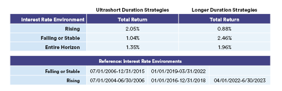 As shown in the tables below, one way to compare the performance of different strategies through different interest rate cycles is based on a historical analysis between an ultrashort duration option (using the ICE BofA 3-Month Treasury Bill Index as a proxy) and the ICE BofA 1-5 Year U.S. Treasury Index.4