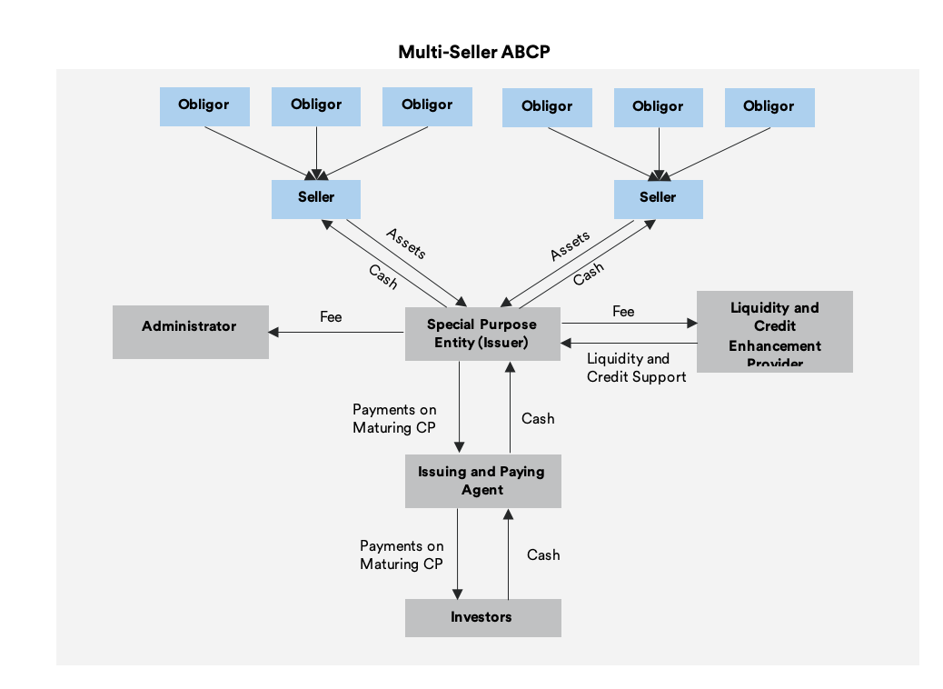 Rowe: The most common type of ABCP structure is called multi-seller. In a multi-seller program, the SPE buys financial assets from different financial institutions. Multi-seller programs are considered diversified since they contain a variety of loans with different credit risk profiles. The following are the key parties in a multi-seller ABCP structure: