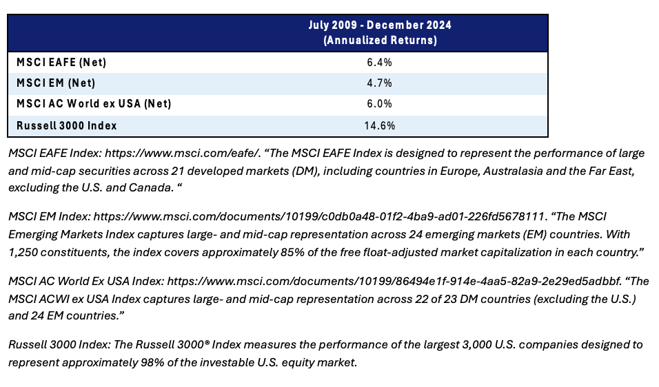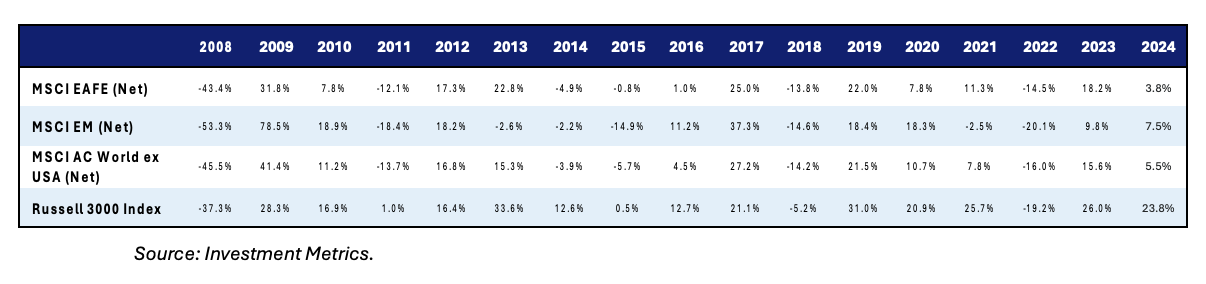 Data clearly shows that international equity returns, which are comprised of market returns across developed and emerging market equities have been anemic when compared to U.S. equity returns since the global financial crisis (GFC). These returns have led some institutional investors to question the merits of maintaining International Equities as part of their strategic asset allocation.