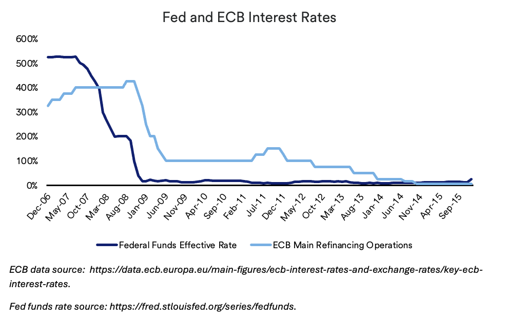 However, other countries did not enact similar stimulus measures, or were slower to do so, which caused U.S. based entities to “recover” at a quicker pace. In fact, the EU. recovery was hampered by competing national interests and a lack of consensus on how to address local housing market distress. A later sovereign debt crisis which originated in Greece in 2009 before spreading to other nations slowed the recovery process even further.