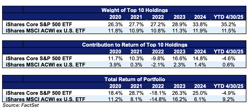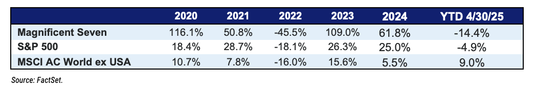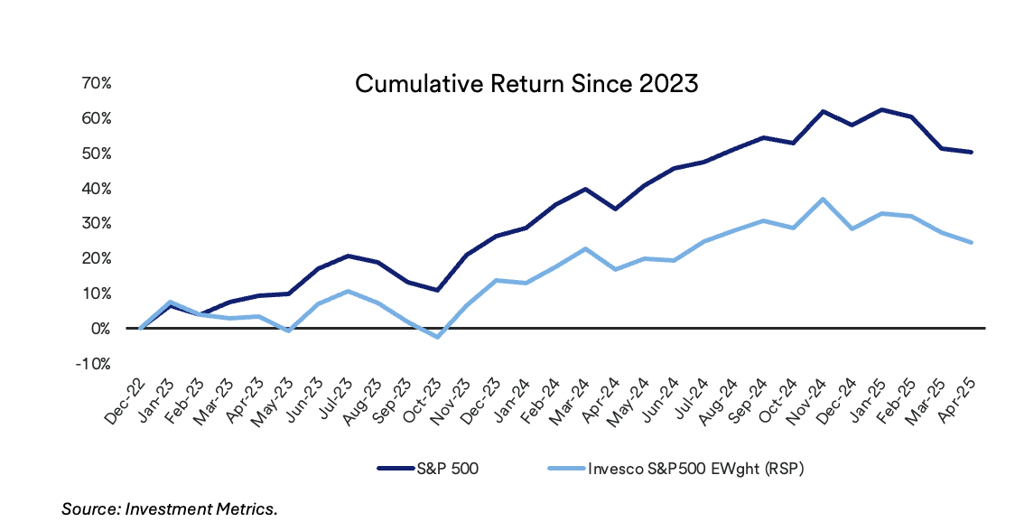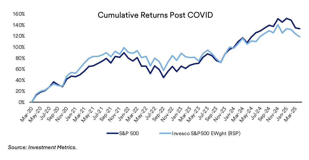 The Magnificent Seven (Apple, Tesla, Microsoft, Amazon, Google, Meta, and Nvidia) have pulled equity markets higher in the post-COVID time frame despite the recent hiccups during the first quarter of 2025. The table below highlights the returns and how these stocks have outgained both domestic and international markets, but even more importantly when comparing the market weighted S&P 500 index to an equal weighted S&P 500 index, we see how much these companies have disproportionately outperformed the average company.